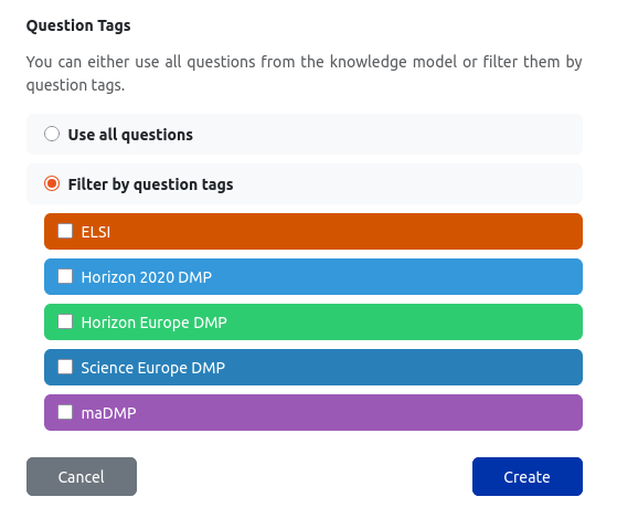 Select “Filter by question tags” and select “Horison 2020 DMP” and click Create.